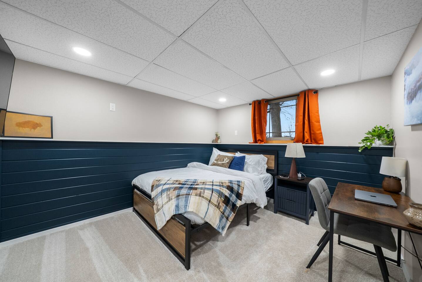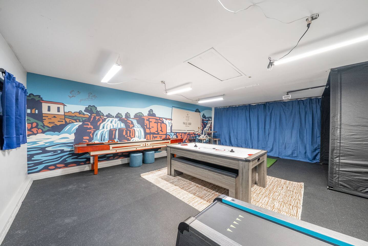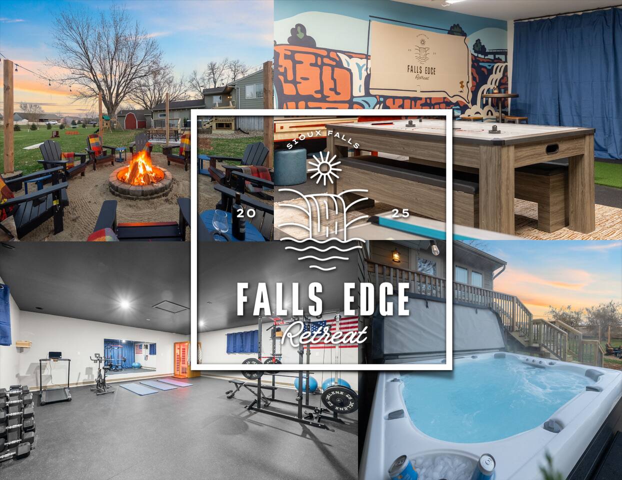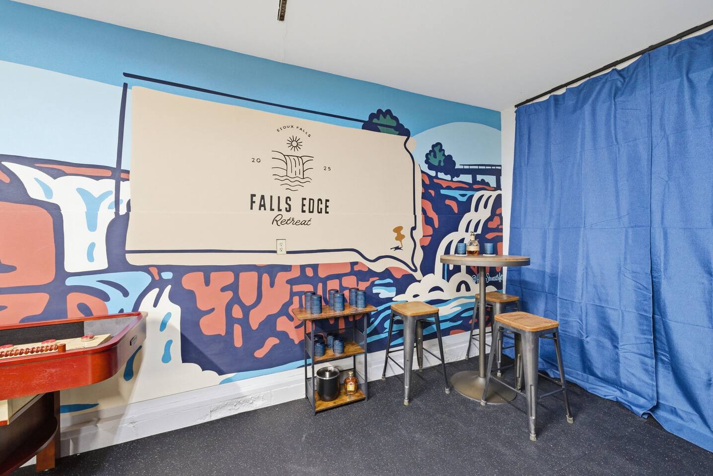Nestled in a peaceful neighborhood just minutes from I-90 and I-29, the home offers both tranquility and convenience. Whether you’re visiting for a sporting event, a family vacation, or a weekend with friends, Falls Edge Retreat has everything you need for a comfortable and memorable stay. The space This spacious two-story home sits on a one-acre lot in a quiet neighborhood right off Marion Road. Thoughtfully designed for comfort and fun, it’s perfect for guests of all ages. Bedrooms -Bedroom 1: King bed · Smart TV · Closet -Bedroom 2: King bed · Smart TV · Closet -Bedroom 3: Queen bed · Smart TV · Workstation desk -Bedroom 4: Two full-size bunk beds · Smart TV · Kids’ play area & games Kitchen & Dining -Fully stocked kitchen with modern appliances and a gas stove -Coffee bar with Keurig and drip coffee maker -Kitchen table seats 6 -Separate dining room seats 8 Living Spaces -Living Room: Cozy couch, two chairs, Smart TV, and a selection of books -Movie Room: Couch, two lounge chairs, Bluetooth projector with screen and sound system, and a popcorn machine -Game Room: Golf simulator, shuffleboard, air hockey and ping pong table, skee-ball, counter seating, and bar stools Gym (unattached garage) -Two-person sauna -Treadmill, exercise bike, power rack, free weights -Yoga balls and mats Outdoor Oasis -Relaxing hot tub -Fire pit with string lights -All-weather dining table and chairs -Extra lounge seating -Gas grill and s’mores sticks -Outdoor games (stored in red shed) - disc golf, bean bag toss, portable volleyball net, connect 4, jenga, sandbox and toys, playset and swings for kids Guest access -Guests have full access to the entire home except the attic and storage under the stairs. -Convenient keypad entry for both the front door and the unattached garage ensures you’ll never be locked out. Extra Touches -Beautiful mural in the game room painted by our favorite local artist. -Custom guest book inside featuring local restaurants and activities, handpicked for an authentic Sioux Falls experience!